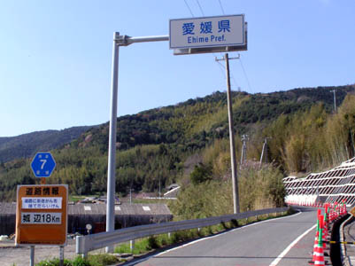 | 春うらら、のどかな風景を進む。ここからがレインボ ーラインと手持ちの地図にある。いよいよ愛媛県に 来た。 左下の道路情報には『道路にあきかんを捨てたら いけん』とお国言葉で書いてある。 ここで重要な情報『城辺まで18Km』を見落とす。 時刻は15時近く、ここまで20Km歩いて来たつもり だから40番がある御荘の街までは残り約10Km 余りの計算。 御荘は城辺の約2Km先にあり標識ではこの道を いくとまだ20Km残していることになる。 |