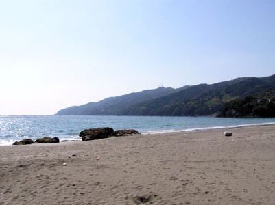 まだ20Kmもあるとは知らず、上の写真の左手の浜に 出て、小休止。 海ものどかで心地よい。 |