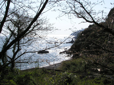 | 春の海と姥桜。 この辺りから、どうもおかしい、、、失敗したようだと 気づく。 大小いくつもの岬と入り江の連続で、ジグザグの道ば かり進んでいる。 いっこうに目的地の方向には、はかどらない。 歩いているのは自分一人、車さえほとんど通らない。 道理で宿毛でレインボーラインへの道を尋ねたときに 誰も知らなかった訳だ。 |