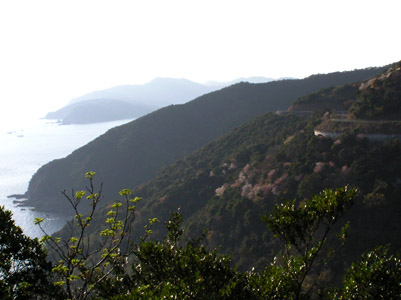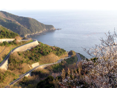 | 大浜の峠に差し掛かる。やれやれ。 実は右の桜に隠れたところにゴミの焼却場がある。 愛媛県は何を考えているのだろう。レインボーライン は大変に景色がいい、観光資源化すべきと思う。 |