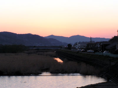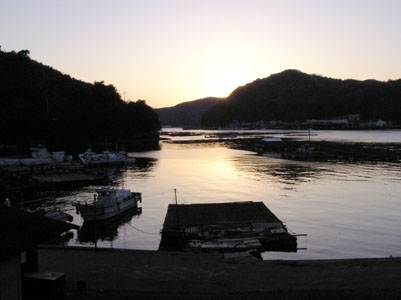 | 敦盛を過ぎ、岩水の辺りを小走りに急いでいると、 軽のバンが10m程前に止まる。運転している人 が手招きをしている。反省も忘れありがたく乗せて 頂く。 彼の方曰く、『自分は他人を乗せないことにして いる、人様の命を預かることはとても責任が重い。 だから今まで他人を乗せたことがない。 でも、 あなたが急いでおられる様子で、まだ観自在 寺まではまだ遠いから』と。 10分程で御荘の町に到着。暮れ方の風景が美しく |