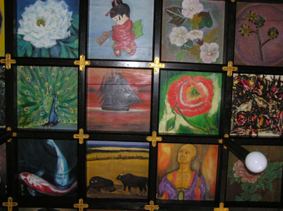 こちらの御本尊は阿弥陀如来、観世音菩薩、不動明王、 薬師如来、地蔵菩薩の五体。 納経所で訳を伺うと、吸収合併を重ねた結果とのこと。 また、本堂の格子天井のはめ絵は、全国から公募され たもので600枚近くあるそうだ。 |