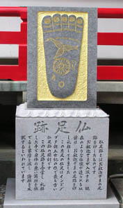 光背のある聖観音像も珍しい。 右は仏足跡。仏像が作られるようになるまで、お釈迦 様の足跡を彫って礼拝されてきたそうで、これはインド の最も古い足跡の模刻。合掌礼拝した手で身体の悪い 箇所を撫でると云々。俄か遍路は、その手を近頃めっき り薄くなった頭部へ、、、。 |