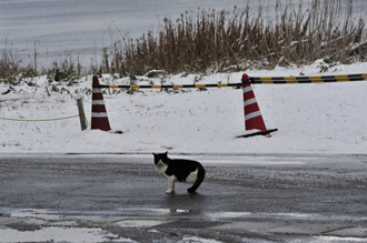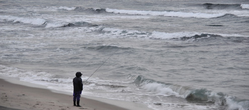 10日、金沢駅から門前急行バスに2時間半近く乗り今回の出発地となる輪島市の門前町に夕刻入った。バスを降りると細雪の能登の海に独り糸を垂れる釣人がいた。
