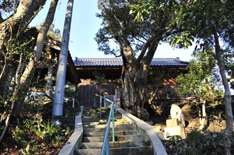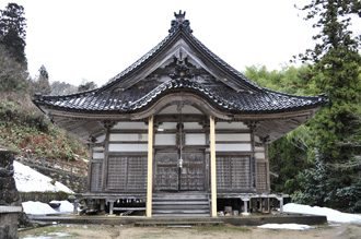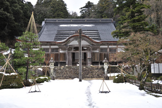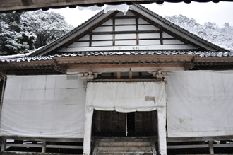 | 本堂への石段、鳥が飛び立った | 本堂正面 雪囲いに包まれて | 境内から曽々木海岸を望む |