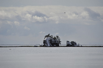 | バス停は高倉漁港に面してあった。穏やかな能登半島の内浦の海を眺めていると、鷹がウミネコを襲う一幕が | ||
