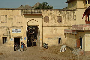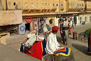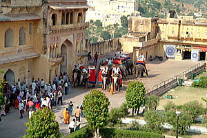 アンベール城までは丘陵のふもとから象のタクシーに乗る。 左の写真は象がタクシー乗り場に出てくるところで、出入口の横には『OFFICE ELEPHANT BOOKING』の看板がある。 やや小柄の象に乗るが、乗ってみると意外に高い、改めて象は大きいと思う。 ドライバーは鉄の棒でしきりに象の頭を叩きながら御していく。 激しく叩くときには象が体をくねらせながら鼻をならす、背中のカゴの上はひどく揺れハラハラする。 20分程で城内に到着、、、ヤレヤレ。