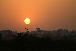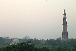 デリー郊外に立つクトゥブ・ミナールの塔、72mの高さがある。世界遺産だが今回は遠望するだけ。 デリーの街に陽が落ち、暮れ始めた市街に戻る。