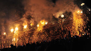 お水取り本業の最後の日、お松明10本が一斉に二月堂に上がる。