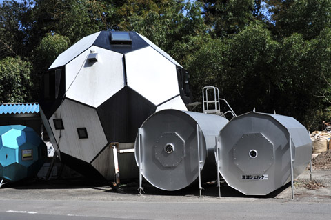 次の弘誓寺に向かって山道を下って行くと、道脇に「津波シェルター」なるものが置いてあった。近くの工場が作って出荷待ちのものだろう。一瞬これはいいと思ったが、三陸の大津波のようなものに耐えられるのか疑問が残った。