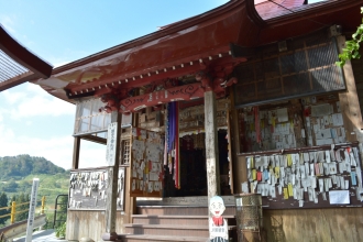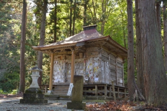| 天童のホテルを出発して尾花沢市に入る。尾花沢の町の手前から東の山間に入って行く。ここも深い木立に包まれたしじまの中に建つお堂だ。幾重にもびっしりと貼られた納め札が、お堂を守る羽毛のように見えた。 | ||