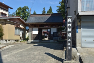 | 尾花沢の町の中心部近くにある。門前に「奥の細道 養泉寺」とある。芭蕉が七泊滞在したというゆかりの寺に観音堂がある。ここで初めて地元の巡礼の方たちと出会った。同年輩の山形と天童と尾花沢の三人の女性で、札所巡りをしていて友達になり、何回も一緒に最上を回っておられるとのこと。 | ||