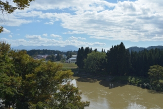 | 尾花沢の町から大石田へ。川前観音は文字通り最上川の前にあり、小高い丘の上にあって最上川を見下ろしている。あいにく清流は台風の雨で濁っていた。 | ||