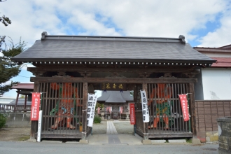 | 西光寺の境内に観音堂はある。山門には大きな赤い仁王像が立つ。江戸末期に地元の彫刻家が浅草の仁王像を模して製作したものという。出羽百観音の旗も見えるが、出羽百観音とは最上・置賜・庄内の三十三ヶ所を合わせて言い、置賜・庄内もいつか回ってみたいと思わせる札所だ。 | ||