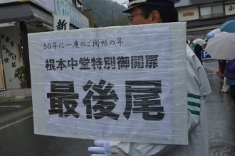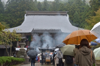 | 今年は山寺根本中堂のご本尊の50年に一度の御開帳の年で、6月13日・7月14日・8月4日・10月20日が御開帳の日で、幸運にも20日に山形に居合わせた。JR仙山線の山寺駅から門前の通りに出ると、長い列ができていた。1時間ほどの待ちと聞いてひるんだが、せっかくだからと最後尾に付いた。 | ||