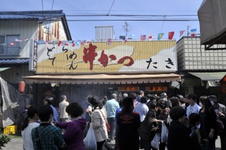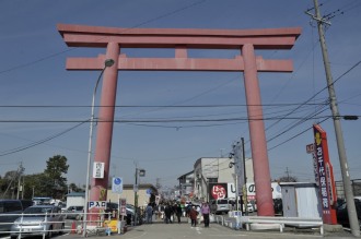 | 番外寄り道 お千代保稲荷 次のバスまで2時間半近くあり、近くにあるお千代保稲荷に参詣した。この日は日曜の初午とあって通称「おちょぼさん」で親しまれているお稲荷さんは、一人居た寶延寺とは打って変わって大賑わいであった。門前の名物は、先ず立ち食いの串カツで、有名な店は行列ができる。ここで昼に鰻を奢って、これも名物の草餅ともろこの佃煮を土産に買った。 |