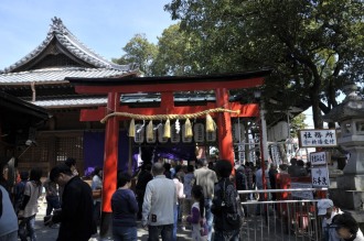 | 大鳥居と賑わう門前町 | おちょぼさん名物串カツ | 本殿 |