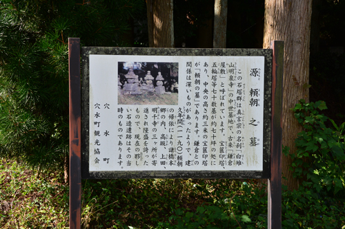 | 明泉寺の手前に鎌倉屋敷と呼ばれた一角があり、中世の石塔群並ぶ。中央奥には源頼朝の墓とされる宝篋印塔が建つ。 | |