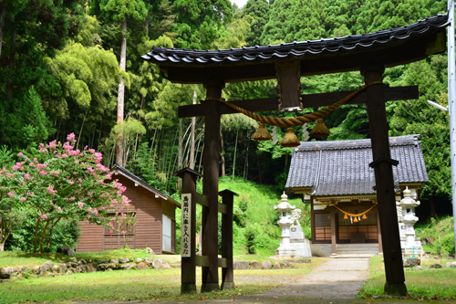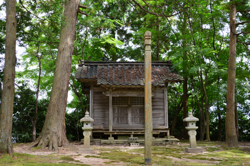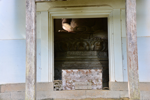 | 林道はUターンできないので、風力発電機の下に車を止めてお堂を探した。15分ほど探して、まだ夏草が生い茂る中に人の踏み分けた跡を見つけることができた。 観音堂は行基が鉈彫りの観音像を祀ったのが始まりと伝わる。 | |