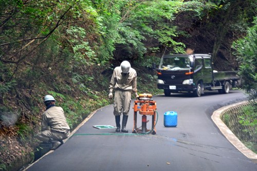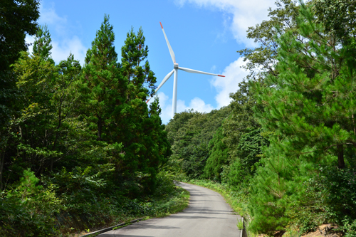 | 今回最大の難所。標高300mの虫ヶ峰山頂へ林道を2.5q駆け登る。林道の入口に工事中・区間通行止めの表示があった。どの区間か分からないので、ままよと進んでいくと少し広い道に出るとやはり工事中。運よく工事はもう終わるという。トラックを退避させるため、100mほどバックして、工事の完了を待った。虫ヶ峰山頂に着くと風力発電機があるだけで、観音堂が見当たらない。 | |