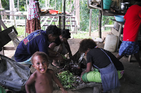 子供たちは人懐こく、我々によく近づいてくる。ライさん一族の女性たちが集まって昼食作りを始める。そのまわりを子供たちが遊びまわる。