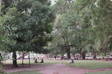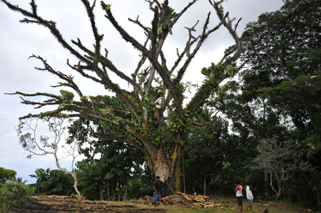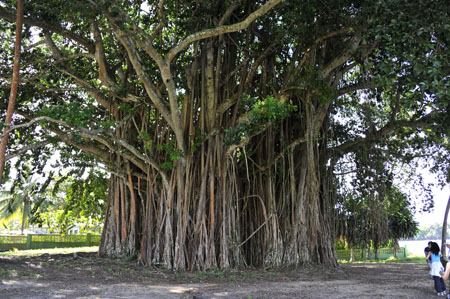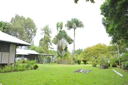 最後に訪れたのはアムロンの丘、第18軍司令部のあったところ。木々に囲まれた家は、軍司令官安達二十三中将が住んでいたといわれる。司令部跡に上の方に葉が扇のように開いた木があった。葉が東の方に向いて開くことから「旅人の木」と呼ばれるとJICAのKさんが教えてくれた。が、東を向いていないように思えた。
