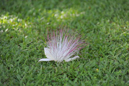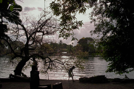 ホテルの庭に大人のこぶしぐらいの大きさの花がまるで地面から咲いているかのように落ちていた。ダミアンツリーという大きな木から落ちてくる花だ。5日はツアーの打ち合わせをJICAでニューギニア政府観光局からマダンのツアー会社に派遣されているKさんと、ダイビングのインストラクターをしている女性のYさんと簡単にした程度で、夜行便と風邪の疲れからか寝てばかりいた。夕暮れに島の人達が小さな舟で島に帰っていく風景が、、、。
