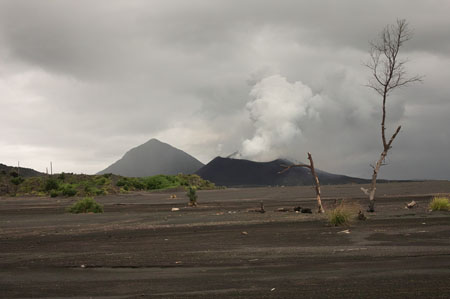 ラバウルの街は1994年の火山の大噴火で一変してしまったという。美しい街並みも5〜6mも積もった火山灰の下に埋もれてしまったようだ。旧飛行場跡地も火山灰が埋め尽くしていた。今も噴煙を上げるダブルブル山(旧日本名:花吹山)。