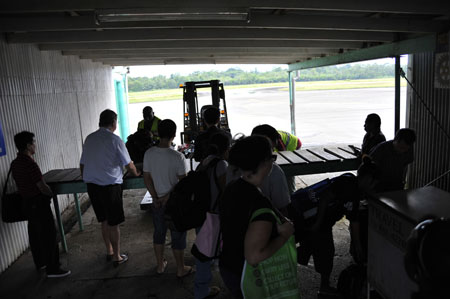 マダン空港では荷物はターンテーブルに乗らず、フォークリフトで運ばれ小さな木の棚の上に置かれる。荷物を受け取って外に出ると驚いた、、、裸足の人がいる!