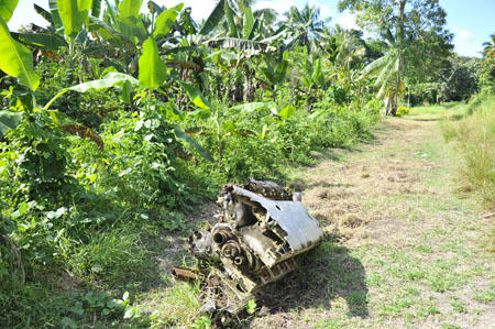 午後は旧日本軍の飛行場後に眠る100式重爆撃機「呑龍」を見に行くことに。途中、飛燕のものだという水冷式エンジンが道端に放置されていた。飛行場付近だという場所は木が少なく腰までの草が生い茂っていた。
