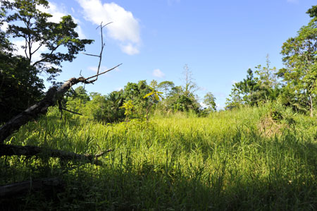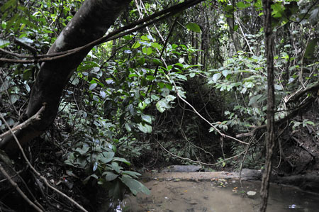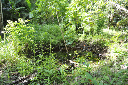 ホテルに帰る途中、マダンを象徴するガシュマロの大木を見学。ホテルに戻るとウエワクで暴動が起き、滑走路に石や空き缶が投げ込まれ空港が閉鎖になったとの連絡が入った。16時30分に私だけサンセット・ツアーに出かける。日没までに時間があったので、日本軍の部隊がジャングルの中の沢づたいにいたというホべ村を訪れることにした。地主のジョエルさんが案内してくれた。ニューギニアではほとんどの土地が個人所有のため、地主の許可がないとこういった場所にも入れない。またこちらでは例えジャングルの中の家でも、自分の住居まわりはとてもきれいに手入れをしている。