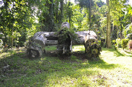森の方に少し入ったところに「呑龍」があった。機体が少しずつはぎとられ年々小さくなっていくという。まわりには爆弾の跡もおおく、直径4〜5mの池になっている。