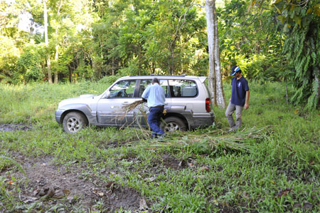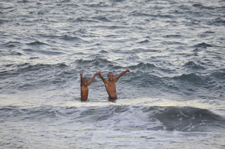 「呑龍」を見て次に向かおうかと車に乗ると、湿地に車がスタックしてしまった。最初の場所は車を押して脱したが、2度目の場所は押してもだめ、救援の車が来てチェーンで引っ張ってもだめ。2時間余り格闘して疲れてしまった。私とJICAのKさんだけ夕暮れが迫る中、ホテルに救援の車で帰った。ホテル近くのマシンガン・ビーチに来ると子供達が泳いでいて、カメラを向けると色んなポーズをとってくれる。