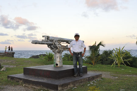 マシンガン・ビーチ、日本軍の速射砲があるからその名がある。ほのかな夕焼けもきれいで、マシンガンの台には現地のカップルがいてなかなか離れない。JICAのKさんが「日本から来たので写真を撮らせてほしい」とお願いして、ようやく記念写真を撮った。