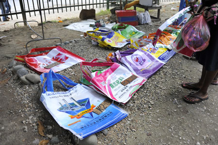 7日は部族の踊りシンシンを北海道と宮崎のダイバー3人と一緒に見学に行くことになった。朝からホテルの近くのマーケットへ買い出しに行く。驚いたことに中国製の肥料の空き袋を利用したショルダーバックがこちらでは流行っていて、マーケットでも売られていた。