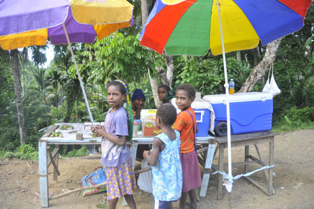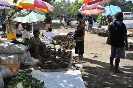 タロイモやその他野菜、そしてニワトリもそのまま一羽買っていく。それにしてもニューギニアの人は挨拶をよく交わしてくる。返事をしないと相手の機嫌を損ねトラブルにもなりかねないので、必ず応えるようJICAのKさんのアドバイスがあった。そこで”モーニン”と”アッピーヌーン”を連発する。