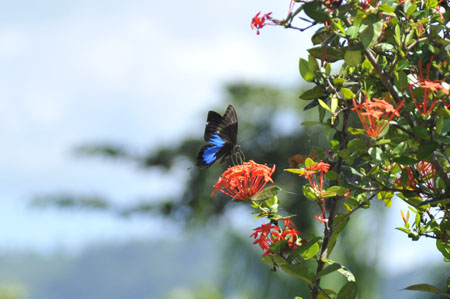 山間の道にも店が出ていて、ドライバーのBusybee氏がタバコ数本を買う。見晴らしのいいところで休憩をしていると大きな青い羽根の蝶が飛んできた。滅多に見ることができないマダン・クイーンだということで皆が追っかけた。ようやく近くで見ることができたが、マダン・クイーンではなくてパピリオユリシスという蝶だとドライバーが教えてくれた。