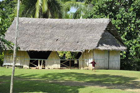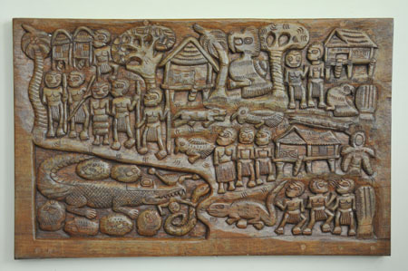 9日の夜は激しい雨が降った。ホテルの中庭はあっという間に水浸しになった。大きな雨粒がザーッと音を立てて矢のように激しく降る、これがニューギニアの雨かと知らされた。ホテルのロビーにストリー・ボードが飾られてあった、一族の物語を子々孫々伝えていく重みのようなものを感じた。