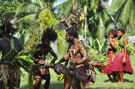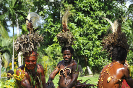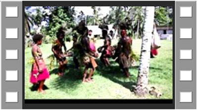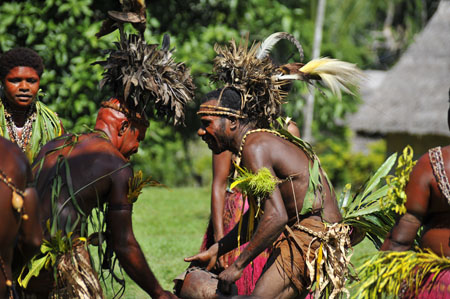 ヤシの実の殻は燃料にもなる。ここで採ったばかりのヤシの実を飲む、採りたての実を飲むのは初めてだがなぜかひんやりと冷たく美味しかった。食事もすんで、いよいよ部族の踊りシンシンが始まる。頭の飾りは極楽鳥の羽根。