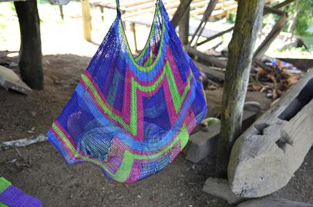 記念撮影をお願いして家の裏に行くと、ビルムという手編み袋の中で赤ちゃんが寝ていた。『国民的バッグ「ビルム」は、高級ブランドに負けないデザイン!』とニューギニア政府観光局のHPで紹介されている。