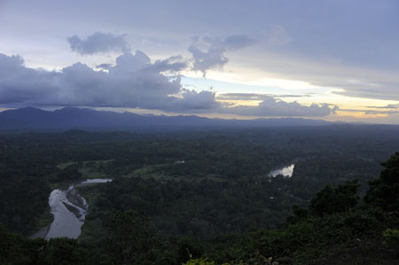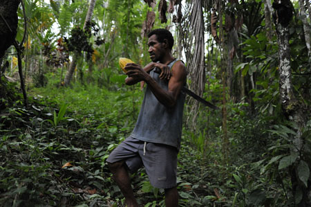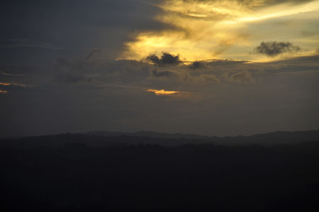 家の近くまで戻ったところでジョエルさんがカカオの実を採ってくれた。トウモロコシを太く大きくしたような感じだ。一片を口にした、なんとなく甘くまた生臭い。夕日の名所と案内してくれた場所はアレメ村の小学校。校庭の端が断崖になっていて、この断崖の上から眺める。下はジャングルでゴーゴル川が流れる、この辺りにも日本軍が展開していたという。遠くの山はシギリッジ山。