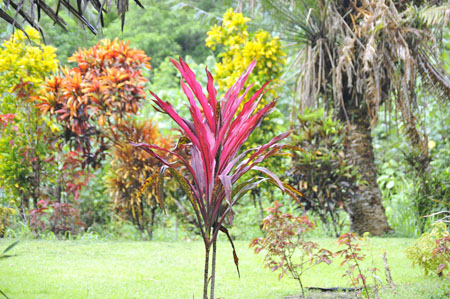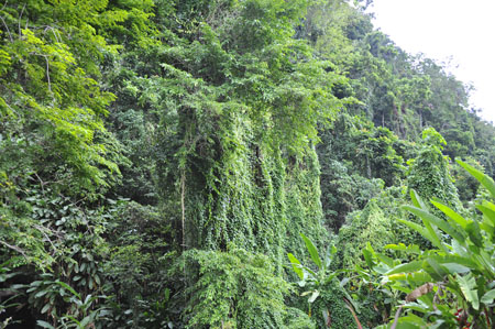帰りにバレック村に寄る。昔ロビンソン・クルーソーの映画が撮られた場所だという。硫黄分の多いエメラルドグリーンの川も流れるが、朱い葉の植物や20m以上も垂れ下がるツタのようなものが群生している方が目を引いた。