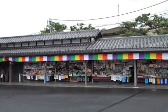 | 東海道線で守山から石山へ進み、京阪電車で石山寺駅に。京阪電車には色んなデザインの車両がある。パトカーの車両は面白いと思った、電車の屋根に赤い回転灯を付けたらキット最高だ。 駅から10分ほど歩いて門前に。この風情豊かな土産物店がいつまでもあることを願う。 | ||