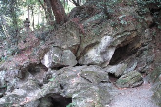 開祖は良弁僧正。本尊の如意輪観音の胎内仏は聖徳太子持仏。多宝塔は源頼朝の寄進とされる。去年来たとき多宝塔は檜皮葺屋根の解体修理中だった。因みに岐阜県の日龍峰寺の多宝塔(重文)は頼朝の妻北条政子の寄進と伝わる。帰りに山を下って「くぐり岩」を発見。くぐって見ようかと思ったが、中でご婦人が難儀されておられるのを見て止めた。 《納経所にて》 寺の方「歩いて回っておられるのですか?」 私 「電車とバスと歩きです。でも歩きすぎて膝を痛めました。観音様にお参りして膝を痛めては間尺に合わないですね」 寺の方「アハハ、どうぞお気をつけて」 |