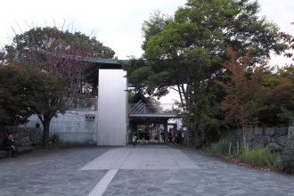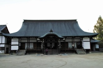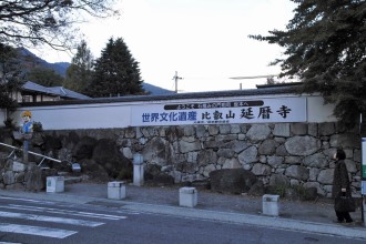 | 急いだ訳はこの生源寺の納経所が4時半で閉まるからで、三井寺駅から坂本駅まで京阪電車で行った。別所駅から乗れば、山門の前を通ったはず。坂本駅は現代アートのを思わせる駅舎であるが、一言でいうと不思議な形だ。駅の前の延暦寺の横断幕を見ると「ようこそ石積みの門前町坂本へ」とあった。その時は気に止めなかったが、後で坂本の二つ手前の駅が穴太でこの地が城郭の石垣などを施工した技術集団「穴太衆(あのうしゅう)」の本拠地であることに気付いた。 さて、生源寺には無事4時前に着き、驚いたことに先客が二人いた。山門に伝教大師御生誕地とあった。 |