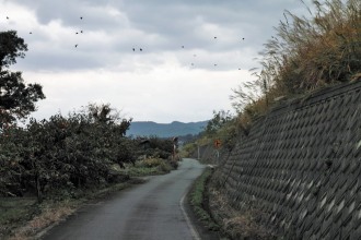 | 近江中庄駅から農道を行く | 左柿畑、右バイパス これを30分歩く | お化けミラー |