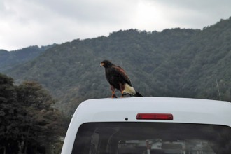 | やがてバイパスをくぐって県道に出ると、見慣れぬ鳥が車の上に止まっている。タカだ。飼い主に話を聞くと、まだ狩りには早いので訓練のためカラス退治をさせるという。恐る恐る近づいて写真を撮る。小一時間かかって酒波(さなみ)寺に到着。参道の奥深くに本堂があり、かつて大伽藍を有した面影がある。 | ||