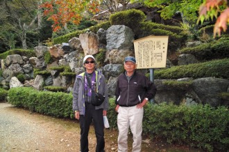 堂守当番の宮部さんには恐れ入った。送迎に観光案内までして下さった。現役時代の話を伺っていて、どうやら会社間のつながりがあったようで意気投合したせいもある。当日は私の前に「湖北観音巡り」で東京から来られた方の応対をされ、宮部さんは昼をまだ摂ってないとのこと。私もコンビニおにぎり2個でお腹が空いてきたので、お礼をしようと食事をお誘いしだが、「お金を始末しろ」と諭された。 宮部さんと記念撮影をし帰路に。(私は緑内障と診断されてから日中屋外ではサングラスを常用している、紫外線がよくないので) |