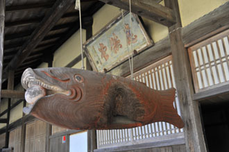 応供堂軒に立派な木魚が釣るされている。合図に打ち鳴らされるため、腹はえぐられた様にすり減っている。また庫裡にはさらに大きな木魚があって、こちらの腹は無事。一種独特の雰囲気を味わったあと、T君に能登川の駅まで送ってもらい、近い内の再開を約して帰路についた。旧友との楽しい札所巡りだった。 T君は数年前に心筋梗塞で病院に運ばれ、心停止しながらも奇跡的に一命を取り留めた人だ。現在も定期的に通院しているとのこと。早い本復を祈る。 |
