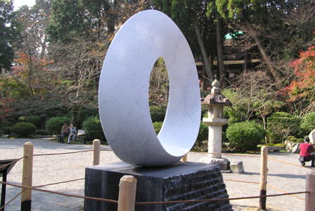 ゆっくり石山寺に参って、1号線を西に進んで京都方面に向かう。 途中琵琶湖側への右折に失敗しUターンしたが、11時頃に到着。こちらも紅葉が見ごろであった。 金堂の前になぜかメビウスの輪のオブジェがある、どうも場所を得てないようだ。折角の国宝の正面景観が損なわれてしまう。